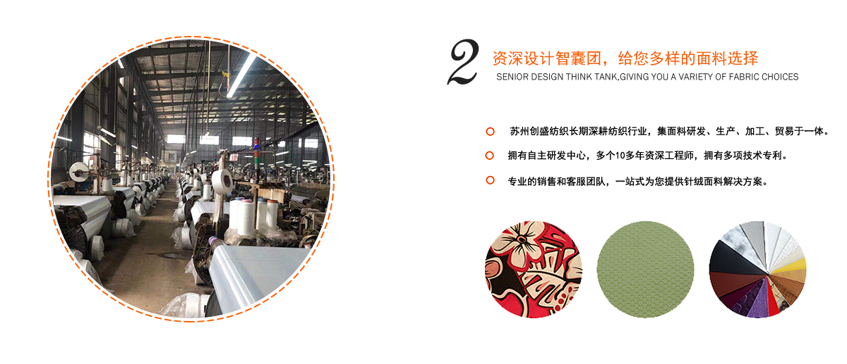蘇州創(chuàng)盛紡織有限公司坐落于江蘇省吳江市盛澤鎮(zhèn)圣塘村,自2004年成立以來,一直致力于中高檔功能型環(huán)保梭織面料的研發(fā)與經(jīng)營,創(chuàng)盛紡織在專注幾十年面料經(jīng)營中,不斷的完善管理,嚴(yán)格的把控品質(zhì),精準(zhǔn)的創(chuàng)新產(chǎn)品,從而讓每一款面料滿足不同客戶的個(gè)性化需求,產(chǎn)品廣泛適用于:嬰兒用品、戶外旅行用品、運(yùn)動(dòng)休閑用品、箱包手袋、家庭收納用品等領(lǐng)域。